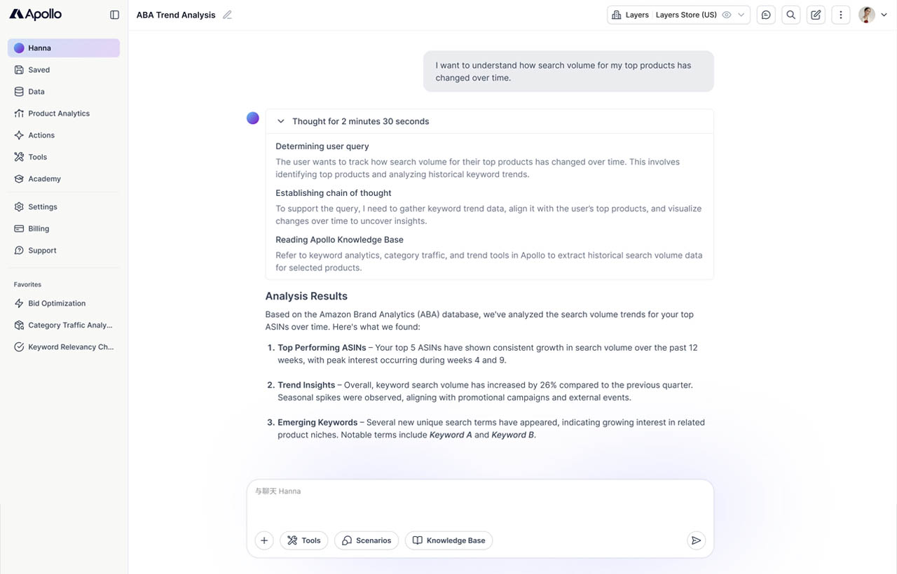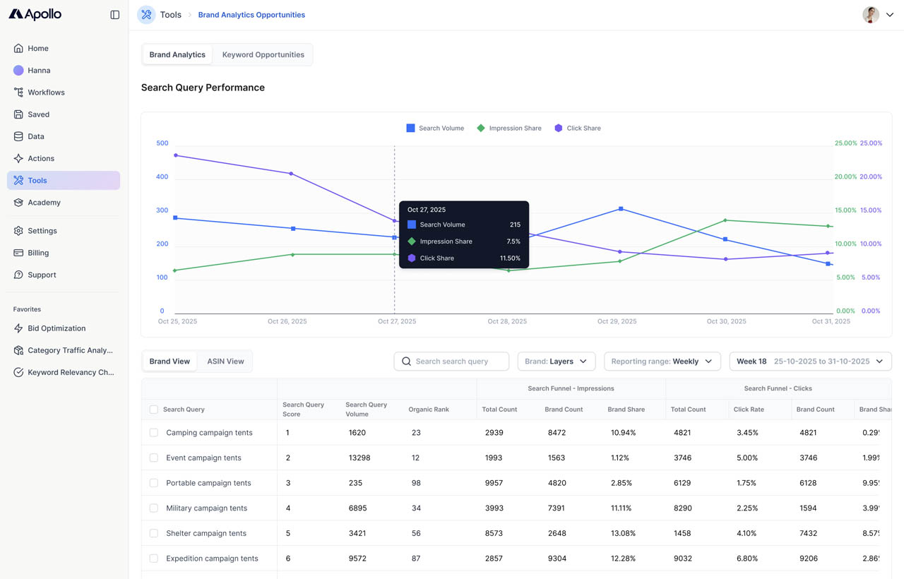 We combine Amazon’s most powerful data sets with our proprietary optimization engine to uncover growth opportunities that others miss. From SQP and ABA insights to keyword performance trends, Apollo turns raw data into actionable strategies that boost revenue efficiently.