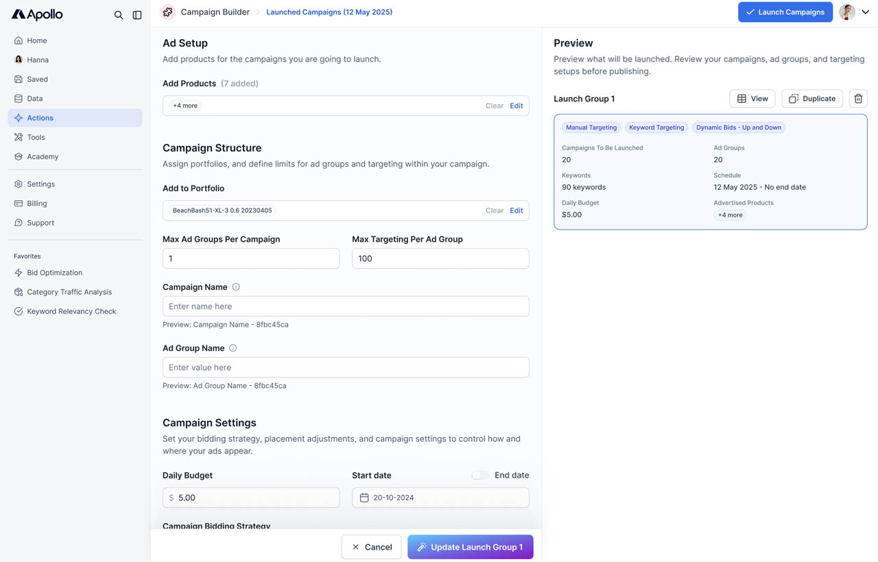 Our Campaign Builder automates large-scale launches, creating conversion-ready campaigns in a single click. Whether testing new products or scaling existing ones, it ensures consistency, precision, and speed while removing repetitive setup. Structured around proven templates and conversion data, it captures traffic quickly without compromising quality, making launches simple and effective so your team can focus on strategy and growth while Hanna manages the execution.